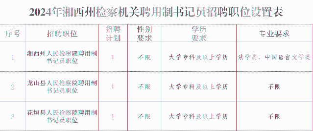 12月25日,湖南省人民检察院发布公开招聘聘用制书记员公告。其中,湘西州检察机关计划招聘聘用制书记员共计3名,具体如下:
