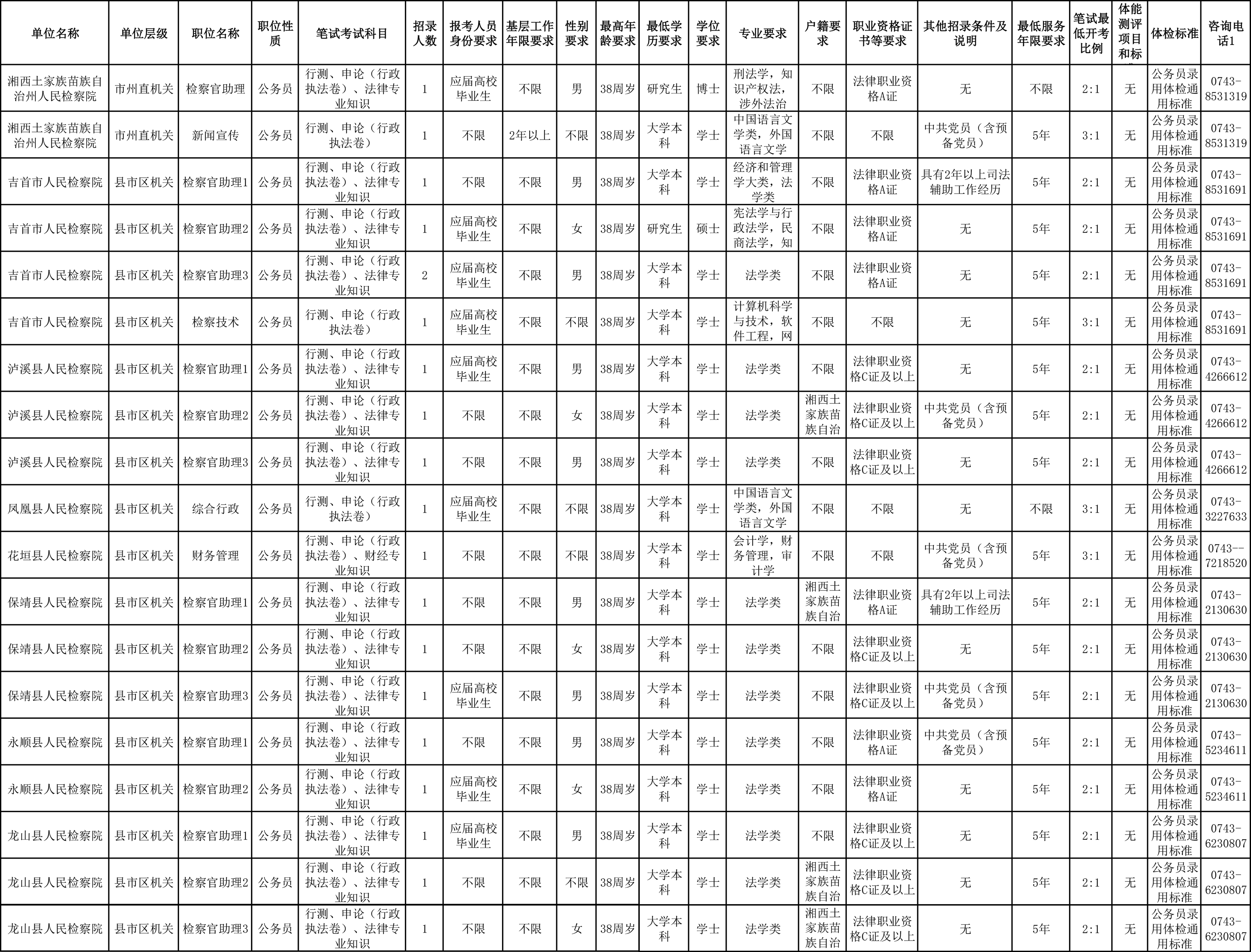 1月13日,《湖南省2026年考试录用公务员公告》发布,湘西州检察机关共招录20人,具体岗位信息如下: