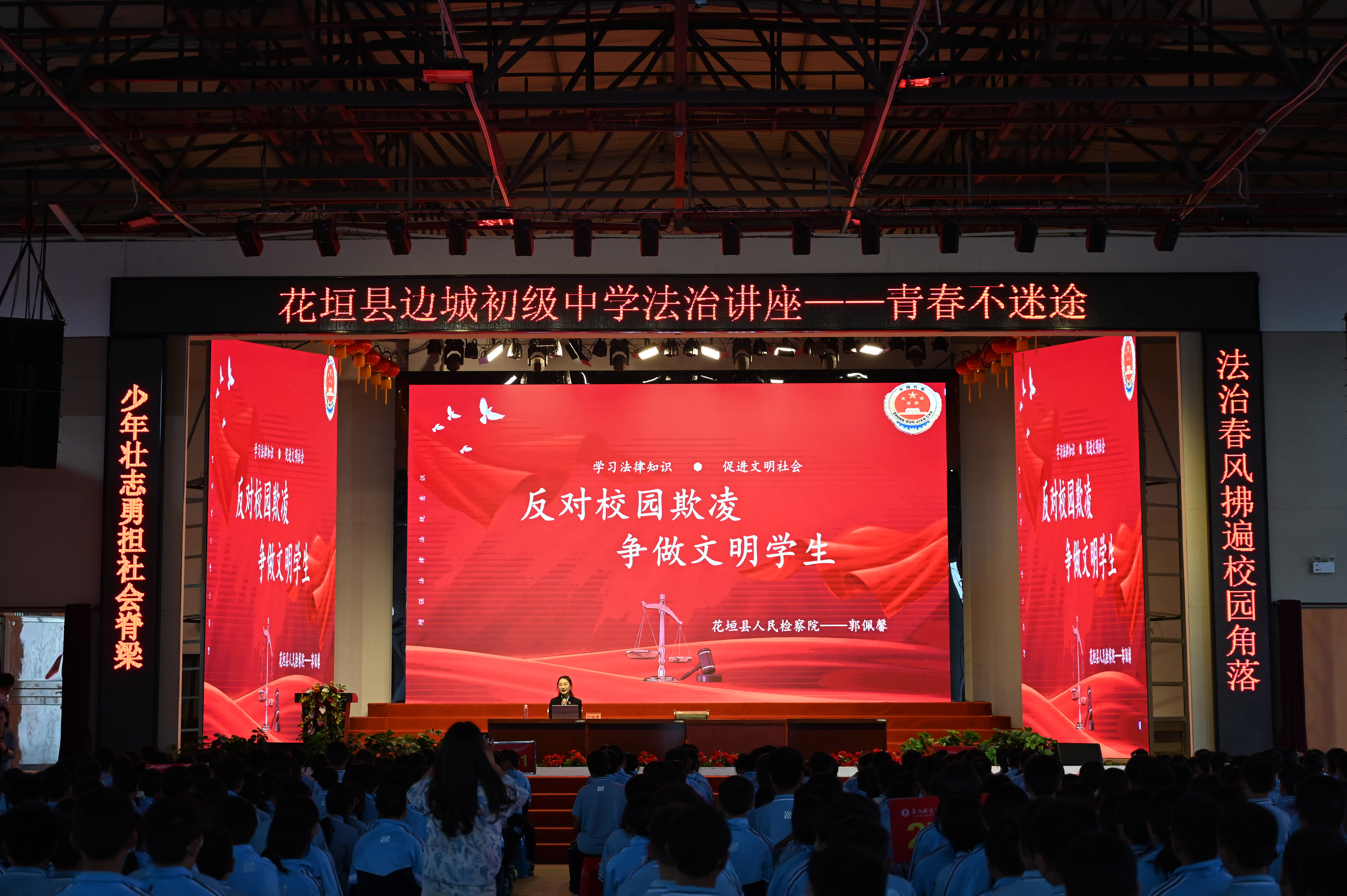 为进一步加强青少年法治教育,提高未成年人自我保护意识,9月23日,花垣县人民检察院干警来到花垣县边城初级中学,向初一年级350余名学生开展以“反对校园欺凌 争做文明学生”为主题的法治宣传教育。
